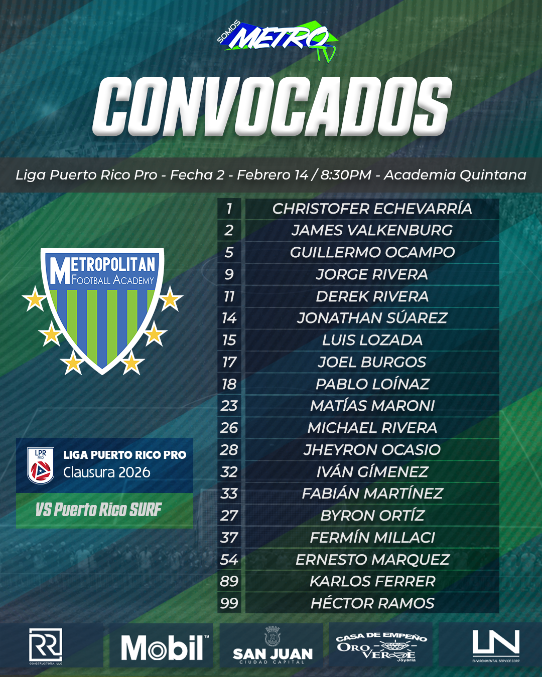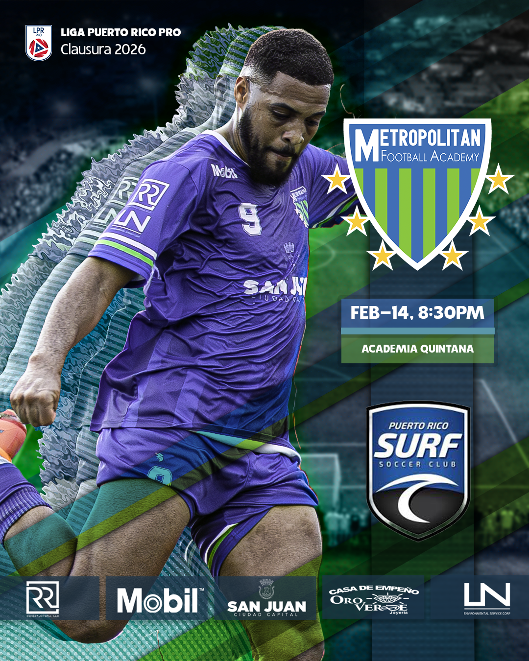 Metropolitan Football Academy se sacudió las dudas en la Jornada 2 del Clausura 2026 de la Liga Puerto Rico Pro con una victoria 3–0 sobre Puerto Rico Surf en Quintana. Joel Burgos abrió el marcador y asumió el liderazgo ofensivo, Cholo Maroni amplió desde el punto penal y Fermín Millaci cerró la cuenta entrando desde el banco, definiendo una jugada que era un casi gol de Jonathan Suárez que fue bloqueado por el portero influencer. Aunque Surf dominó la posesión y tuvo fases largas con el balón, Metropolitan manejó mejor los momentos del partido, corrigió errores defensivos de la jornada inaugural y fue más efectivo en las áreas, respaldado por una actuación sólida de Ernesto Márquez bajo los tres palos.